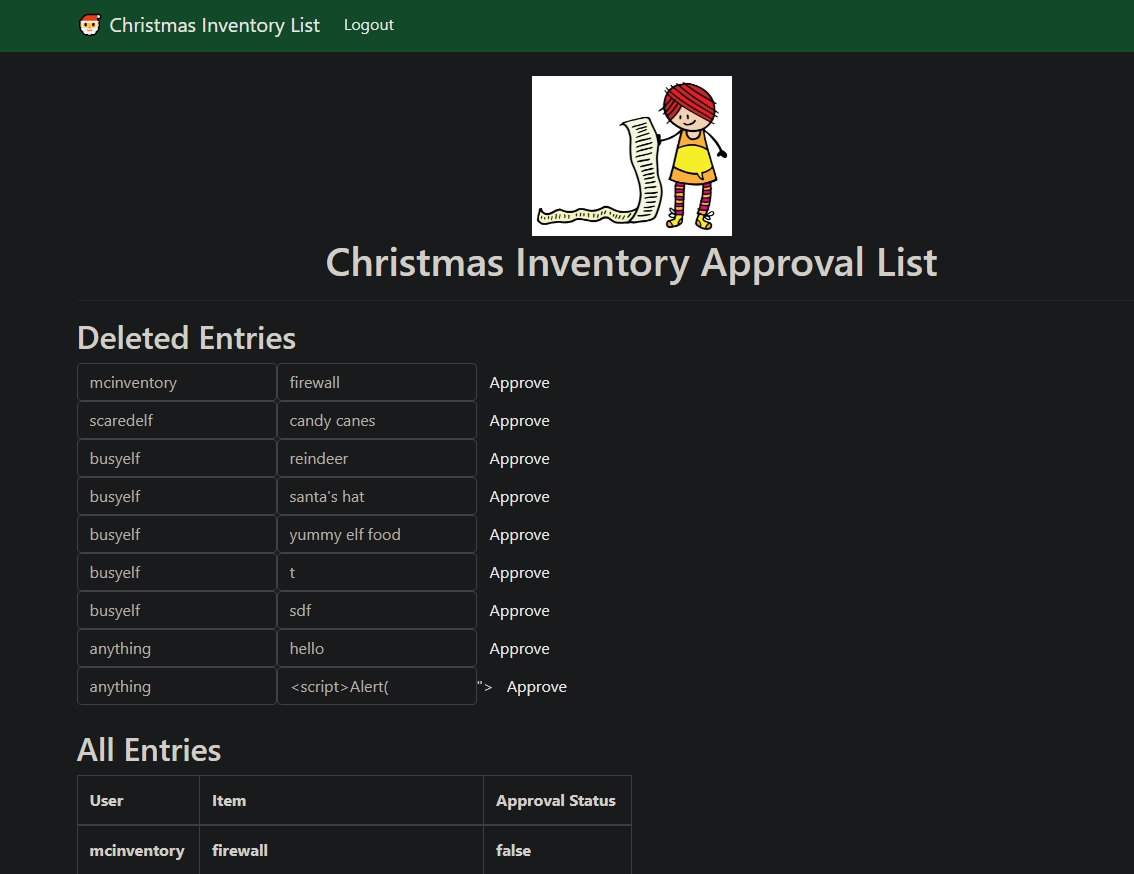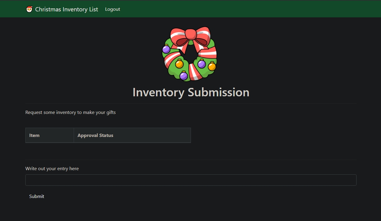 Elves needed a way to submit their inventory - have a web page where they submit their requests and the elf mc inventory can look at what others have submitted to approve their requests. It’s a busy time for my inventory as elves are starting to put in their orders. mc inventory rushes into McElferson’s office.