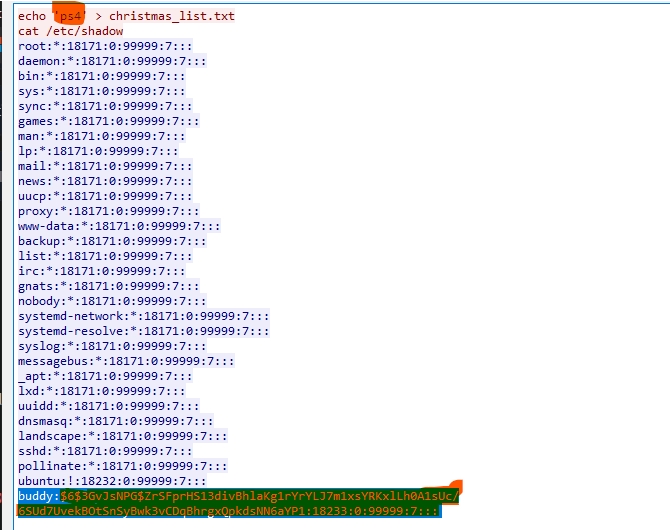 Q3: Crack buddy's password! A: rainbow Solution In the previous step, we see the attacker use the cat command to see the content of the shadow file there we can see the buddy user so now we can crack its hash with john or hashcat but in my case I use john. So first copy that hash and save it to a file for example that name is hash.txt