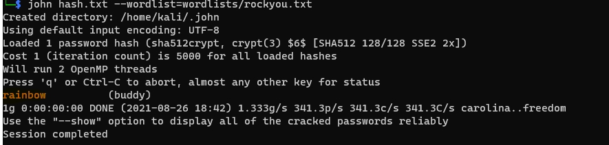 $ john hash.txt --wordlist=/usr/share/wordlists/rockyou.txt